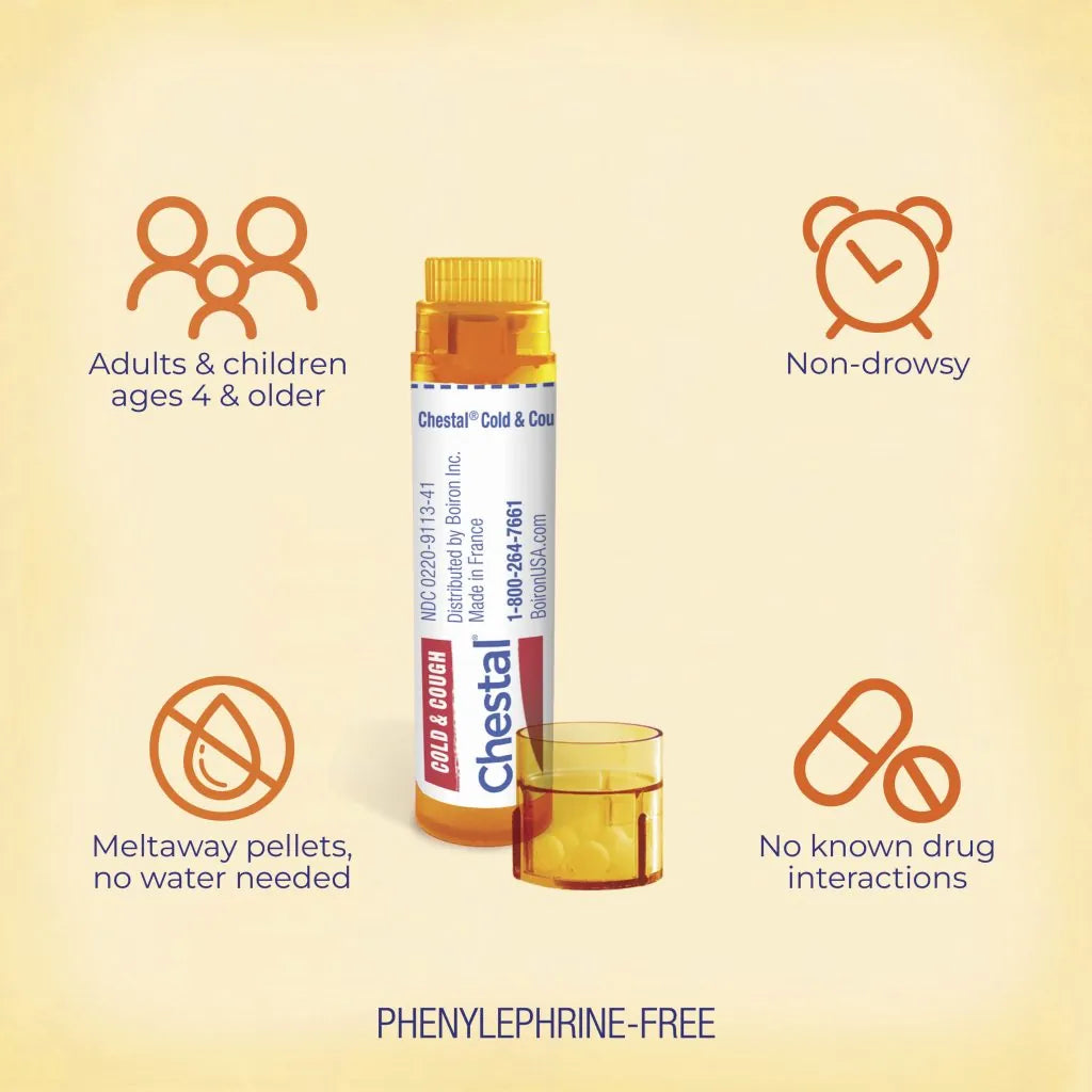 Enjoy the same trusted relief of Chestal Cold & Cough Syrup in a convenient meltaway pellet option. These dissolvable homeopathic granules melt under the tongue to target common cold and cough symptoms, including nasal and chest congestion, fitful cough, sneezing, occasional minor sore throat, and a runny or stuffy nose.*