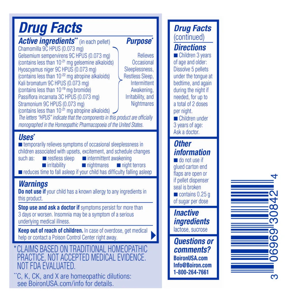 - Made with plant-based and other pure active ingredients to address occasional sleeplessness, restless sleep, intermittent awakening, irritability, nightmares, and night terrors.*